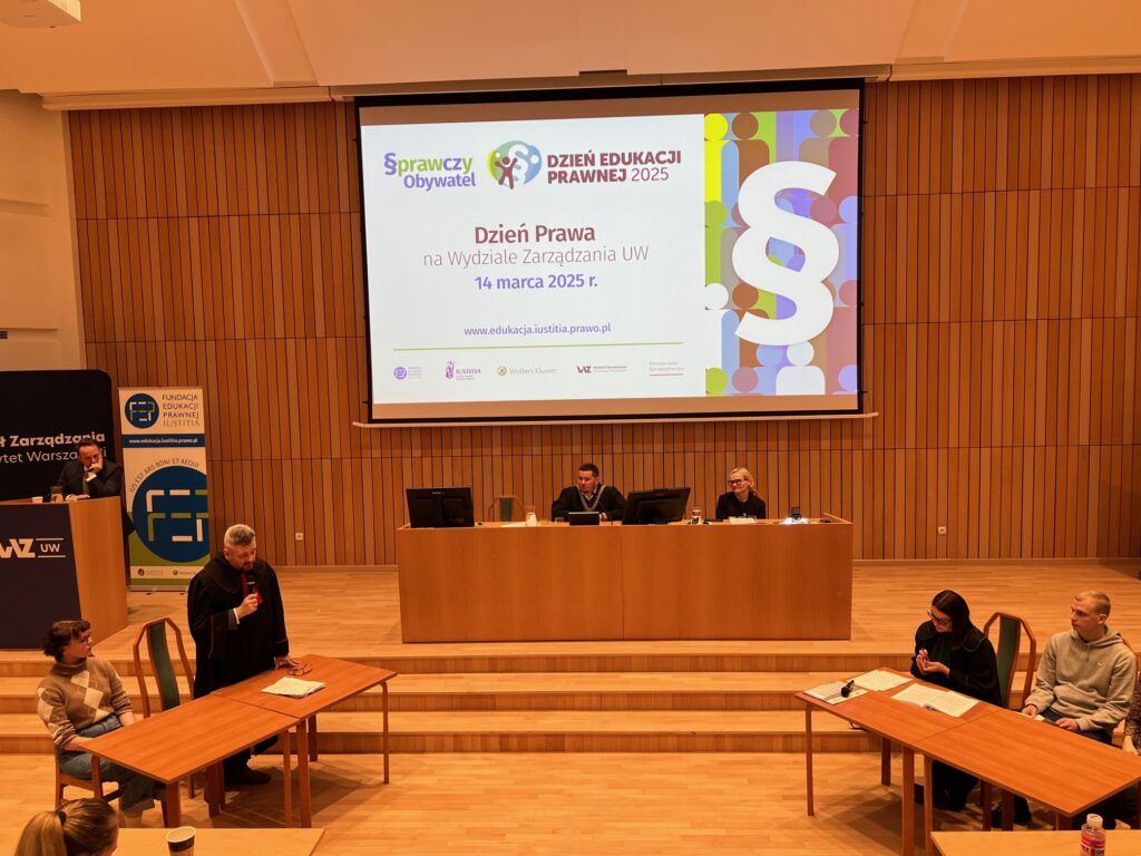 Dzień Edukacji Prawnej 2025 zainaugurujemy 14 marca spotkaniem z uczniami ze szkół średnich na Wydziale Zarządzania UW. Będziemy rozmawiać o specyfice zawodów prawniczych, wykorzystaniu sztucznej inteligencji, a także zaprosimy uczniów do uczestnictwa w symulacji rozprawy aresztowej. Wydarzenie organizowane jest we współpracy z Wydziałem Zarządzania UW, Stowarzyszeniem Sędziów Polskich IUSITIA Wolters Kluwer Polska. Rejestracja już jest zamknięta.